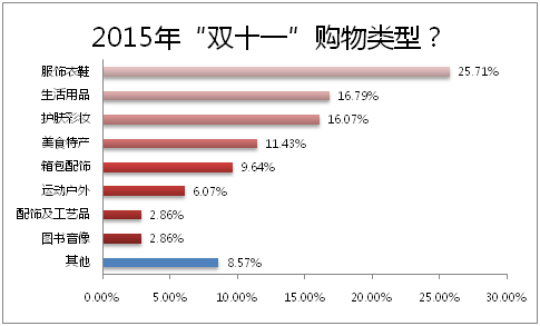 在购物类型方面,今年“双十一”期间选购主要以服饰衣鞋为主,占比25.71%;其次为平时所有的生活用品,占比16.79%;再次为女性所用的护肤彩妆方面的产品,占比16.07%。
