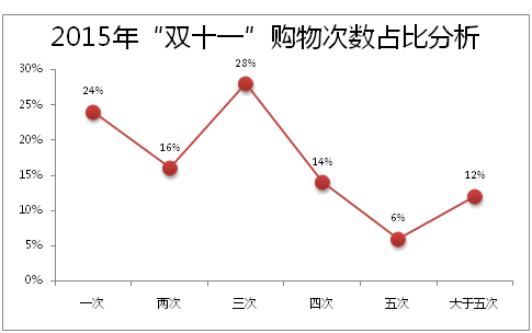 在2015“双十一”购物期间,国内购物达到三次的人群所占总比例的28%;而仅参与一次性购物的人群占比总人数的24%,同时,参与两次购物购物的人群占比16%。