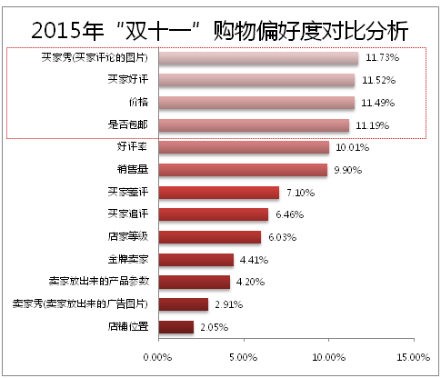 从消费者购物偏好来看,线上买家秀往往更容易进行筛选挑剔,并成为吸引购买的关键因素之一,占比为11.73%;而买家好评位居其次,占比11.52%;再次是价格优势成为影响购买决策的关键,占比11.49%。这些不仅代表了典型的互联网营销文化,更体现出了中国消费者的强大购买力以及快时尚的购物偏好。