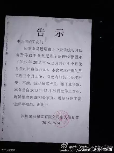 上面内容显示,中天信公司生产经营发生严重困难,资金链断裂,无法继续经营,因此从今天起提前解散所有在籍职的员工。12月25日,圣诞节。深圳中天信几千名工人却在这天丢掉了工作!