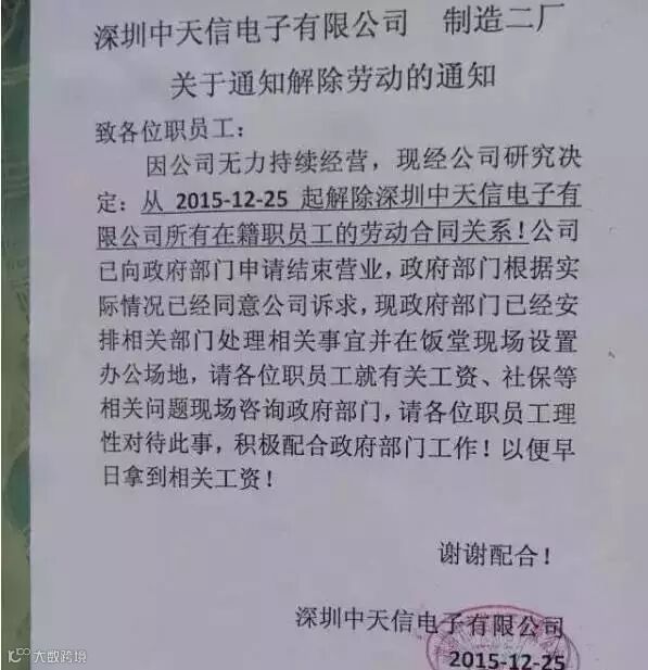 就在工厂老板承诺春节前一定兑现全部工资后,12月25日圣诞节,一纸文书,打破了2600名员工的平静!深圳中天信宣布歇业,两千员工被解除合同,突然失业!