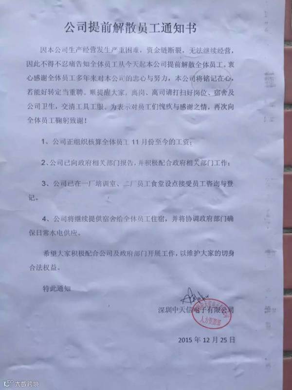 ▲中天信发布的提前解散员工的通知