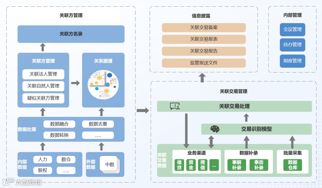 一是融合内外部数据形成关联方名录,提供关联方管理、穿透识别能力;