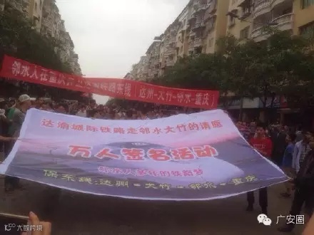 5月7日,广安市发展委在回复网友咨询时称,经广安市委、市政府研究,明确提出广安市只接受“西线方案为达渝铁路项目线路具体走向方案”,并且已经向四川省发改委上报了广安方面对于达渝铁路选址的态度。此言引起邻水群众的不满,并最终引发街头聚集。