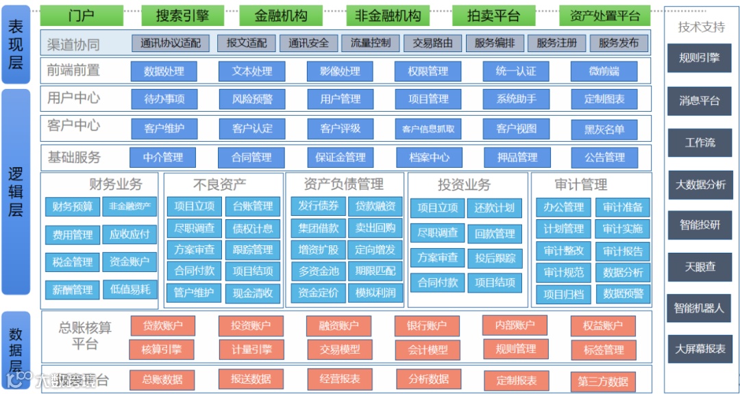 当前数字经济正带动中国整体经济的升级和转型,传统行业的数字化转型势在必行。中国人民银行《金融科技发展规划(2019-2021年)》中提出,强化金融科技合理应用,探索新型技术在金融领域安全应用,全面提升金融科技应用水平,将金融科技打造成为金融高质量发展的新“引擎”。这给信息技术、互联网+以及大数据和数字化技术在金融业的应用提供了良好的政策环境。但不良资产处置作为非标业务,线上化结构化难度大,需要从提升AMC自身的业务效率入手,提炼不良资产处置的核心流程和关键要素,搭建服务于AMC的信息技术平台,完成从信息化到数字化再到智能化的飞跃,这对信息化建设专业服务商提出了更高的要求。