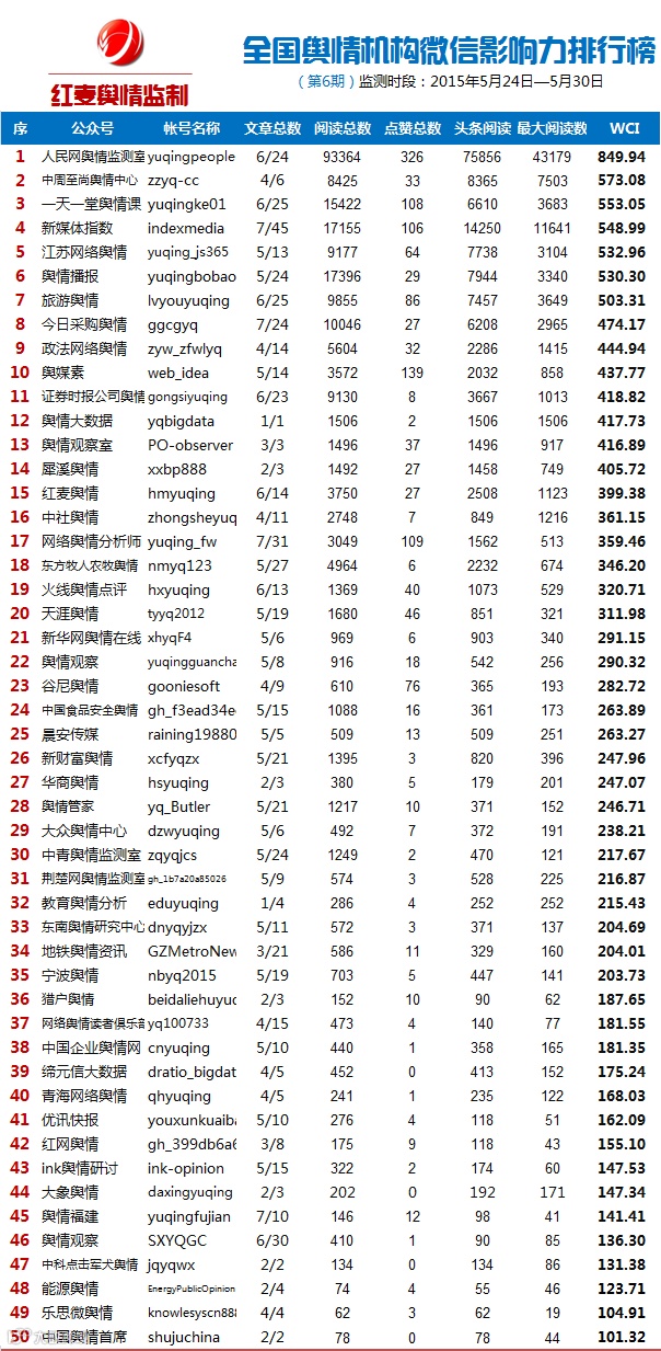 今日,红麦舆情统计出上周(5月24日-5月30日)舆情机构利用微信公众账号推送信息排名前50微信账号为样本进行分析,点赞总数为1492余次,同时,阅读总数达到了236383次。