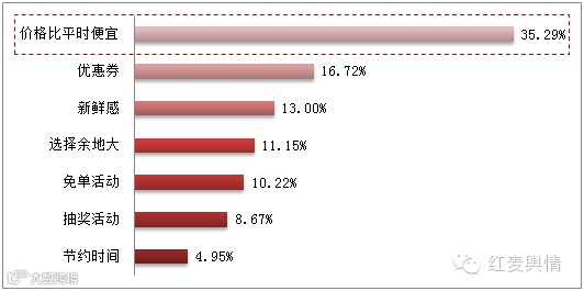 据红麦舆情数据显示,民众所参与双十一购物的人群中,公认为“价格比平时便宜”是产生购物欲望主要因素之一,占比为35.29%(见图1)。