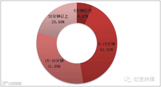 从红麦舆情数据显示,消费者购物的习惯停留时间一般较长,至少在5-15分钟左右,其人群占比为41.01%;而花费较长时间(15-30分钟)来甄选最优质的商家的购物者也不在少数,占比为31.65%(见图3)。