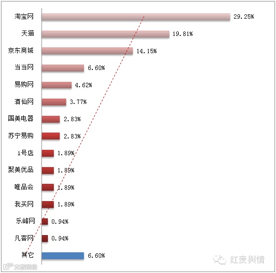 然而,1号店、聚美优品、唯品会、我买网等网站关注度相对不佳。今年双十一淘宝和天猫巧夺销售市场空间并遥遥领先,但紧跟其后的其他电商也毫不示弱,随着用户对于商品品质的积累,使得用户对商品品牌的要求也是越来越高,京东、苏宁、当当等B2C网站吸走了不少淘宝上的中高端用户,再加之万达进军电商的日子也不远了,天猫淘宝的市场竞争压力也是越来越大。