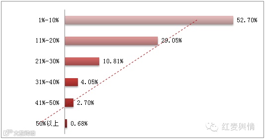 而商家在销售优惠力度方面,其性价比成为国内双十一购物潮的动因之一。今年双十一网购优惠度在1%-10%区间的商品居多,占比达到了52.70%;而优惠力度在11%-20%区间的占比29.05%;而优惠力度控制在一半以的差价较为少见,仅为0.68%(见图6)。尽管今年的双十一优惠力度还是很给力,但也不排除部分商家们在商品的促销中所出现的“先涨价后降价”的个别现象。