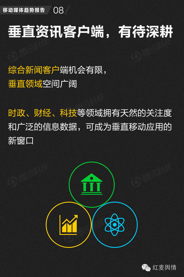 综合新闻客户端机会有限,但在垂直领域可谓空间广阔。时政、财经、科技等领域拥有天然的关注度和广泛的信息数据,可称为垂直移动应用的新窗口。