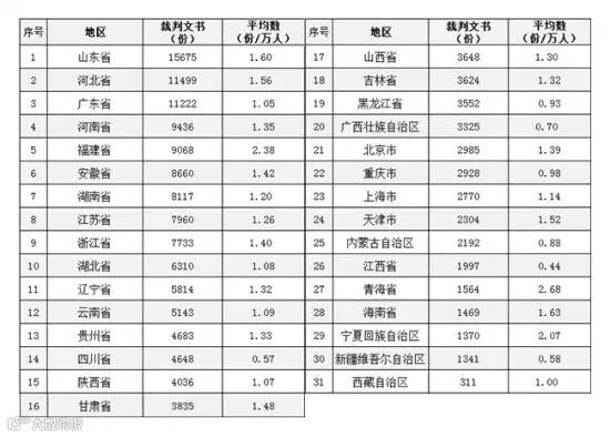 新浪网统计的中国裁判文书网判决总量跟判决与当地人口占比