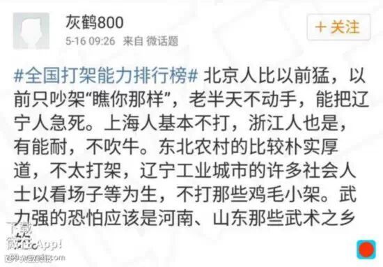 “真没见过河南人打人,不细说”、“四川人看似温柔,内心总是憋着股劲”、“两个北京人打架,带出200个小弟”、“广东单兵作战能力一般”、“甘肃西北狼的称号不是白给的,民风剽悍,下手狠辣,不轻易出手,一出手必见红”。