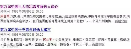 在百度检索“贺业军”出现了很多关于他参选“第九届中国十大杰出青年候选人”的信息。