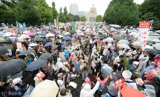 到了7月,随着日本国会开始表决安保法案,民间的抗议示威浪潮也渐渐进入高潮。在7月14号,日本国会特别委员会表决通过安保法案前一天,就有近两万名日本民众在东京日比谷公园举行大规模示威游行,反对安保法案。