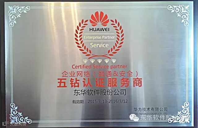3月13日,在2015华为中国合作伙伴大会上,东华软件股份公司获颁华为最高级别的“五钻认证服务商”(CSP五钻)奖牌,成为首批授牌的五钻认证服务商之一,同时东华软件也成为华为企业网络(数通&安全)方向在全球范围内首家和当前唯一的五钻认证服务商。
