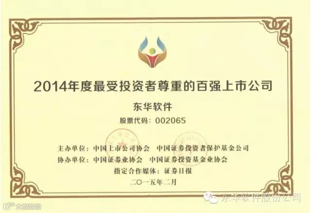 2月15日,由中国上市公司协会与投保基金公司联合中国证券业协会、中国基金业协会共同举办的 “最受投资者尊重的上市公司评选”活动在北京隆重召开,东华软件荣获“2014年度最受投资者尊重的百强上市公司”称号。此次活动评选出来的100家最受投资者尊重的上市公司,是A股2635家上市公司中的优秀公司代表。