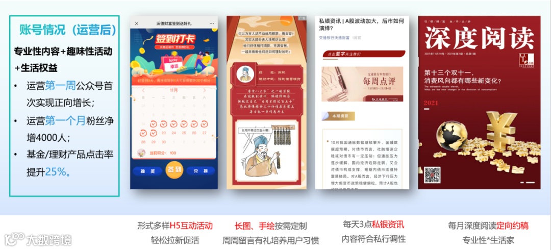 银企汇新媒体运营服务依托独有的数字营销平台,结合金融机构品牌特色,为其量身定制宣传、推广、营销策略,提供服务涵盖视觉设计、内容运营、活动运营、H5传媒、宣传海报、粉丝管理等多方面,全面提升金融业务与品牌推广的深广度。同时紧扣媒体发展新趋势,向客户提供视频制作服务,包括创意策划、脚本编写、视频拍摄、视频剪辑等,有效解决金融机构营销成本过高、难以精准了解粉丝群体等痛点,助力金融机构拓展新用户,提升用户品牌忠诚度,实现用户交易转化,促进金融机构的高质量发展。