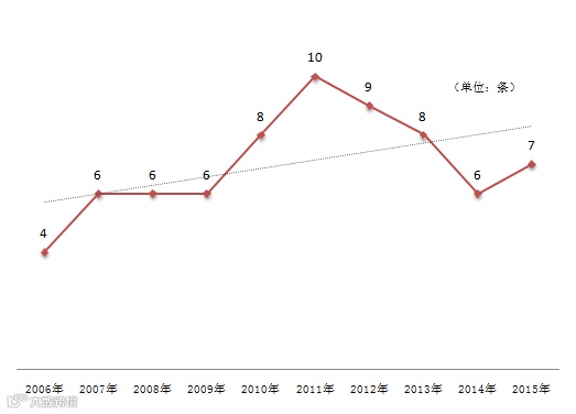 今年,红麦舆情在去年《2014年央视315舆情分析报告》基础之上继续进行梳理,增加了2015年所曝光的7起主题事件。红麦舆情发现,在节目直播时间上,虽然是《焦点访谈》播出的总理记者见面会特别节目,推迟到20:44播出,但今年的播放总体时间(02:00:44)超过了去年315的时间(01:49:30)。同时,今年央视315所曝光主体事件比往年略有回升(见图1)。
