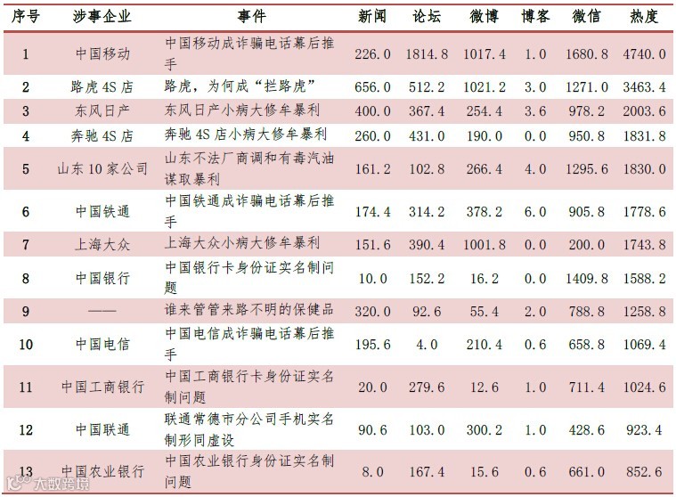 据红麦舆情统计,今年315所曝光的典型案例共48件(不含消费预警以及消费提示内容),远远超过往年(39件)曝光的数量,红麦舆情筛选出(热度值>850)13家企业(见表1),其中大部分涉及到央企、国企等类型企业,但众多企业并没有慌乱了手脚,而是反映比较“平静”。