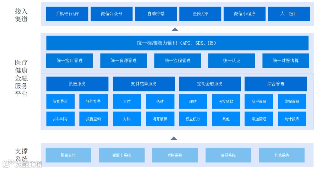 东华银医服务平台以银行为主体,贯彻“金融服务无处不在”的方针,整合区域医疗资源,通过银医合作,建立互利互赢的“金融服务生态圈”。打造银行医疗健康场景,拓展银行服务范围,输出银行支付渠道,将银行支付结算能力与医院场景相融合,提供支付宝、微信、银行卡、聚合支付等多种支付渠道;针对特定人群的推出金融理财产品和贷款产品等,为银行拓展优质企业客户,同时也为个人客户提供更多的优质服务。银医服务平台提供门诊服务,提供患者提供就诊人管理、智能导诊、预约挂号、门诊缴费、排队候诊、一卡通充值、报告查询、患者满意度调查等;提供住院服务,包括住院登记、床位预约、押金收缴、出院结算、住院清单等;提供医院微官网进行医院特色介绍,向患者展示医院介绍、特色科室、名医推荐、就医指南、医院地图、新闻动态等;并提供体检预约、核酸检测预约等多种特色服务,提供患者APP入口、公众号、小程序、自助终端、人工窗口等多服务渠道,打造线上+线下多渠道就医环境,提供统一产品服务,全面优化就诊流程,改善就医环境,真正帮助患者轻松就医。