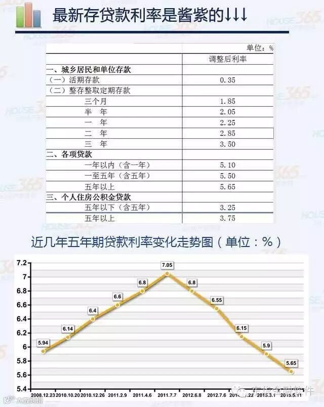 中国人民银行决定,自2015年5月11日起下调金融机构人民币贷款和存款基准利率。金融机构一年期贷款基准利率下调0.25个百分点至5.1%;一年期存款基准利率下调0.25个百分点至2.25%,同时结合推进利率市场化改革,将金融机构存款利率浮动区间的上限由存款基准利率的1.3倍调整为1.5倍;其他各档次贷款及存款基准利率、个人住房公积金存贷款利率相应调整。