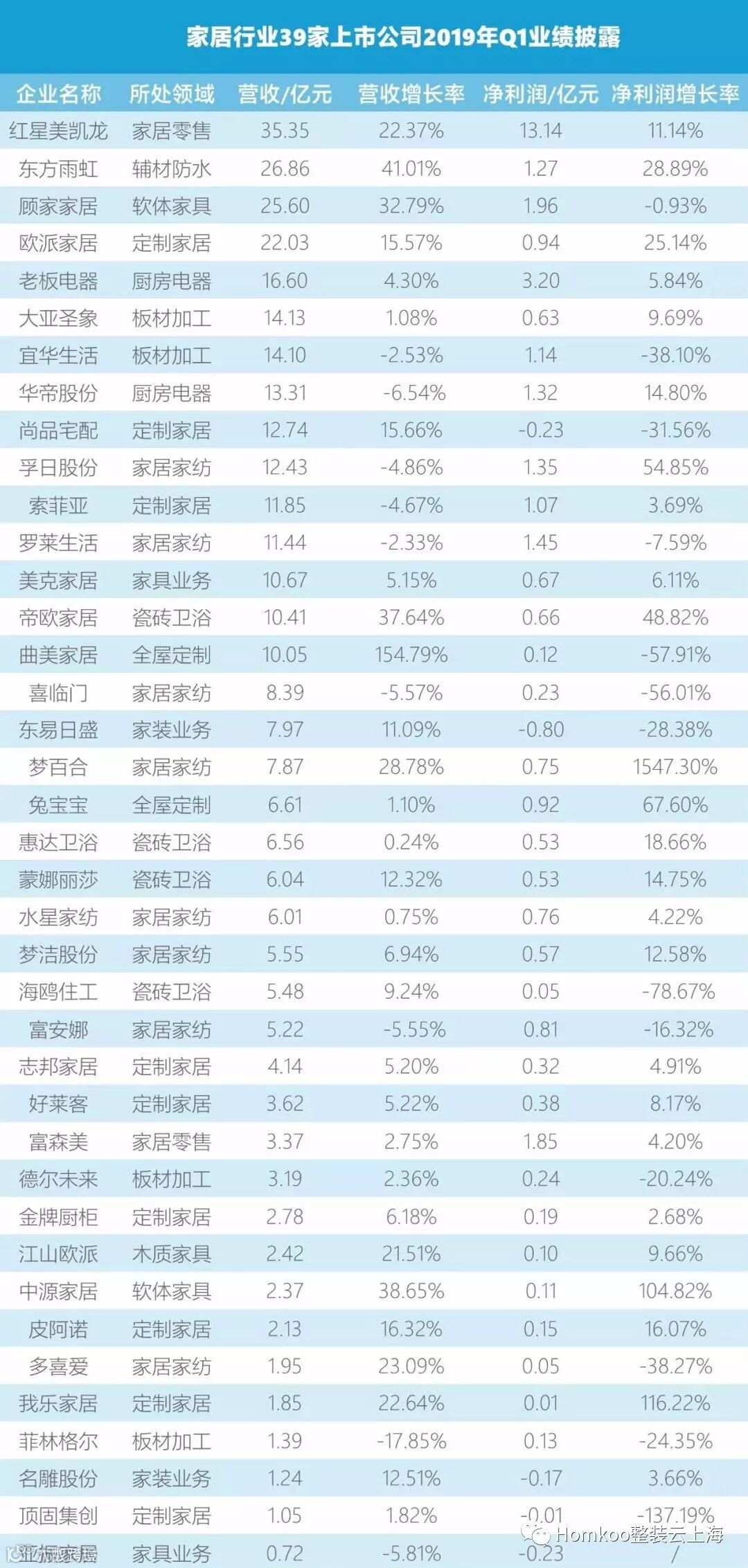 2019年已过半,中美贸易战进入白热化阶段,国内经济形势不容乐观,家居行业颓势尽显。据调查数据统计,家居行业39家上市公司2019年第一季度的业绩并不乐观。31家企业的净利润增长率低于20%,占比达到79%;12家企业净利润增速为负值,占比达到31%;32家企业的营收增速低于25%,占比达到82%。结合上述情况来看,家居行业2019年一季度运营情况远比此前统计的2018年年报数据表现还要差。