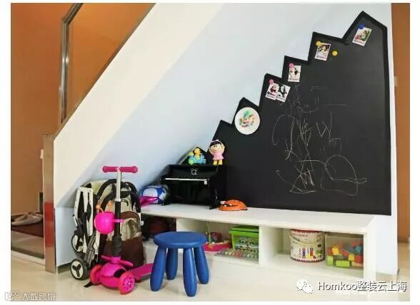 楼梯下方被邓小姐打造成孩子的涂鸦区,墙面贴一张磁性黑板贴,能画画,也能展示些生活照,再放个地柜,小宝贝的画画工具都能收纳了。