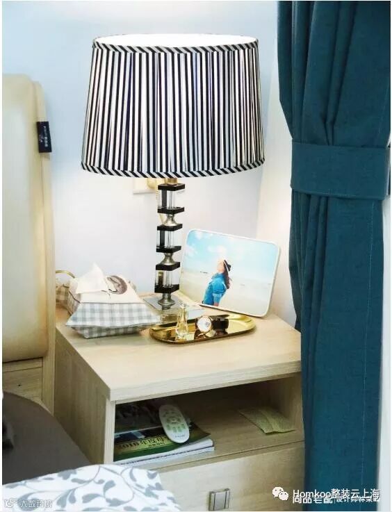 床的另一侧是台灯与床头小柜的组合,将房间里一些细碎的东西收在这里,再也不怕丢了。