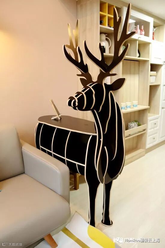 沙发旁边的黑胡桃转头麋鹿书架实在是引人注目,极具个性,是边几,也是一种隔断,偶尔想坐在沙发上看本书,随手就能取出。