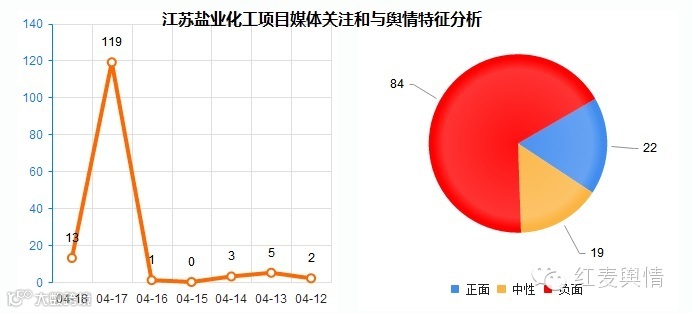 4月17日,《第一财经日报》(A4:要闻)发表《江苏盐业化工项目巨亏5亿》的报道,此话题的相关舆情热度在百度贴吧、凯迪社区、温州论坛、股吧以及各大媒体上快速升温,媒体关注到达119家。
