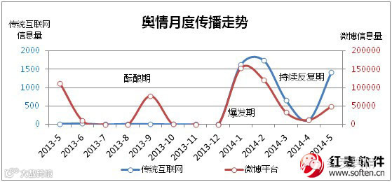 据红麦舆情监测系统(www.sofen.cn)监测显示2013年5月1日 至2014年5月9日,共监测到事件相关互联网信息575,813条。其中,在2013年5月和9月出现了两次微博传播的前期高潮,但并未引起更广泛的关注。直至2014年1月,事件开始全面爆发,随着事件的后续发展,于2月至5月出现了持续、反复的趋势。