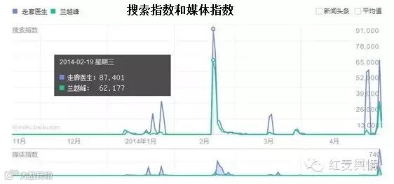 此外,通过比较两图的不同,我们还发现,两类平台对于传播内容的偏好存在明显差异---百度网民搜索的峰值出现在2月,既“绵阳市人民医院工作人员罢工”被各大网络媒体报道期间;而新浪微博热议度峰值则出现在1月“走廊医生”兰越峰被央视两次曝光期间。