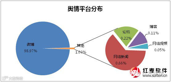 在与事件相关的全部信息中,微博信息量占据98.97%,是事件传播的最主要载体。此外,网络新闻(含平媒电子版)占0.66%,论坛占0.22%,博客占0.11%,网络视频(含电视节目转载)占0.05%。