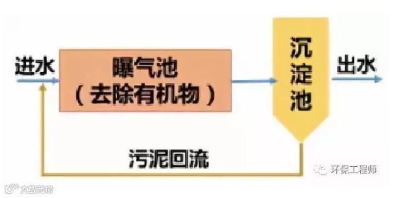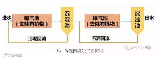 早期的两段法只是将一套活性污泥法的两组构筑物串联,一段和二段曝气池体积相同,且多合并建设,大部分有机物在第一段被吸附降解,第二段的污泥负荷很低,其出水水质要优于相同体积曝气池的单级活性污泥法(如图7)。然而,由于第一段曝气池体积减小了一倍,相当于污泥负荷增加了一倍,处在易发生污泥膨胀的阶段,运行管理较为困难。