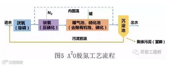 70年代,美国专家在A/O工艺的基础上,再加上除磷就成了A2O工艺(如图5)。我国1986年建厂的广州大坦沙污水处理厂,采用的就是A2O工艺,当时的设计处理水量为15万吨,是当时世界上最大的采用A2O工艺的污水处理厂。