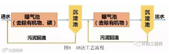 20世纪70年代中期,德国的Botho Bohnke教授开发了AB工艺(如图8)。该工艺在传统两段法的基础上进一步提高了第一段即A段的污泥负荷,以高负荷、短泥龄的方式运行,而B段与常规活性污泥法相似,负荷较低,泥龄较长,A段由于泥龄短、泥量大对磷的去除效果很好,经A段去除了大量的有机物以后B段的体积可大大减小,其低负荷的运行方式可提高出水水质。但是由于A段去除了大量的有机物导致B段碳源缺失,所以在处理低浓度的城市污水时该工艺的优势并不明显。