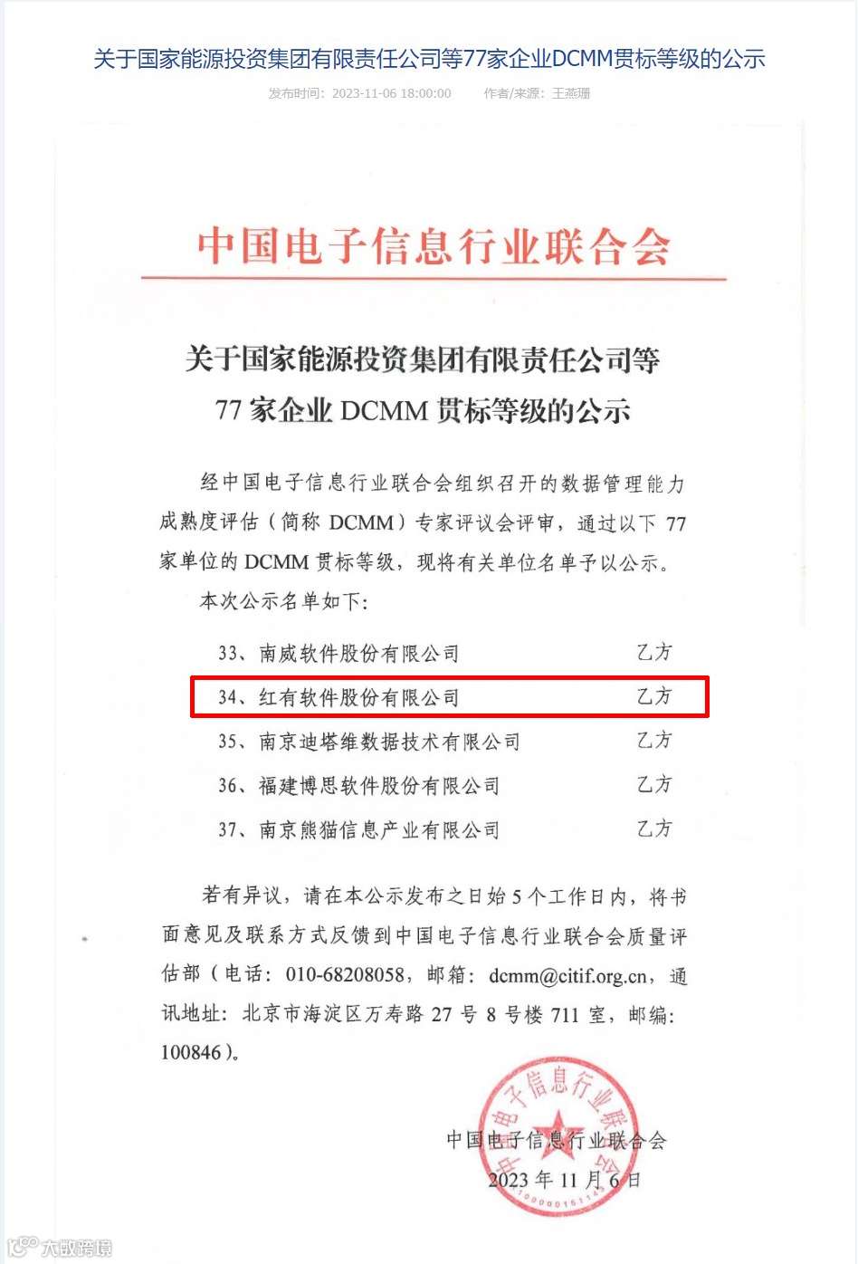 》,红有软件股份有限公司位列DCMM稳健级(三级)认证公示名单。