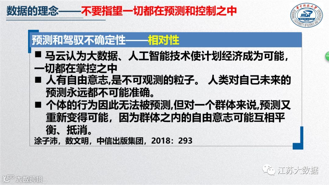 最后,需要注意的是,不要指望一切都在预测和控制之中。近几年有专家说:大数据、人工智能计划经济成为可能,马云也有这样的观点,认为什么都可以掌握,但我觉得这是不可能的。人是有自由意志的,你发布了什么计划,你一定要我种花生,那我想种别的东西,假如说我是一个农民的话,除非你规定任何你只能够生产什么、工作什么,这个是不可能的事情。如果说你有一些预测,而我因为你的预测马上做出改变。显然,经过改变,原来的东西实际上已经发生了变化。因此,很多个体行为是无法预测的,但对一个群体来说,预测又是可能的,因为群体之内的自由意志可能相互平衡抵消。但我们认为一切都在掌控之中、控制之中是不大可能的。