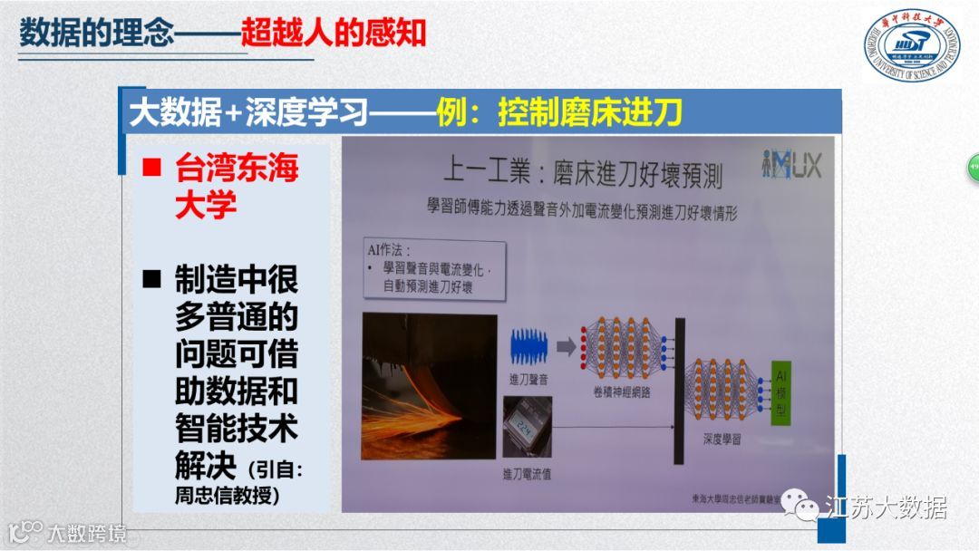 我们要超越人的感知,例如,我几个月前去台湾一个很普通的大学参观,其中的一个教授说:控制磨床进刀,老师傅通过听模具的声音可以判别出其质量如何,或者应该如何去控制。然而,他们通过测量噪声,噪声要测量很容易,测量电流的变化,把数据收集起来和质量等进行深度学习。结果显示数据分析之后的磨床进刀控制要比人的感知好得多。