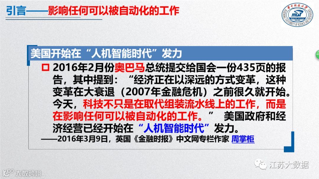 其实几年前奥巴马和美国国会提交的一份报告里谈到:科技不只是在取代组装流水线上的工作,而是在影响任何可以被自动化的工作。即传统的自动化替代的是人的体力,但未来不一样,简单地讲是指人的脑力。