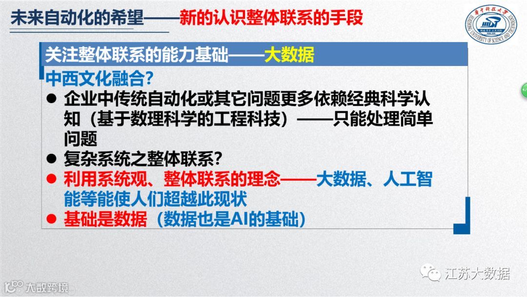 所以对于一个复杂系统来讲,其整体的联系是非常重要的。我们强调中国文化里大系统观整体联系,它是有合理解释的,只是以前的现代科学缺乏技术去认识它。我们古人是通过经验、感悟去互联的。但现在我们不能通过经验感悟去处理很多问题,只能通过数据科学、人工智能技术等去认识这些整体联系,不确定性的问题等等。