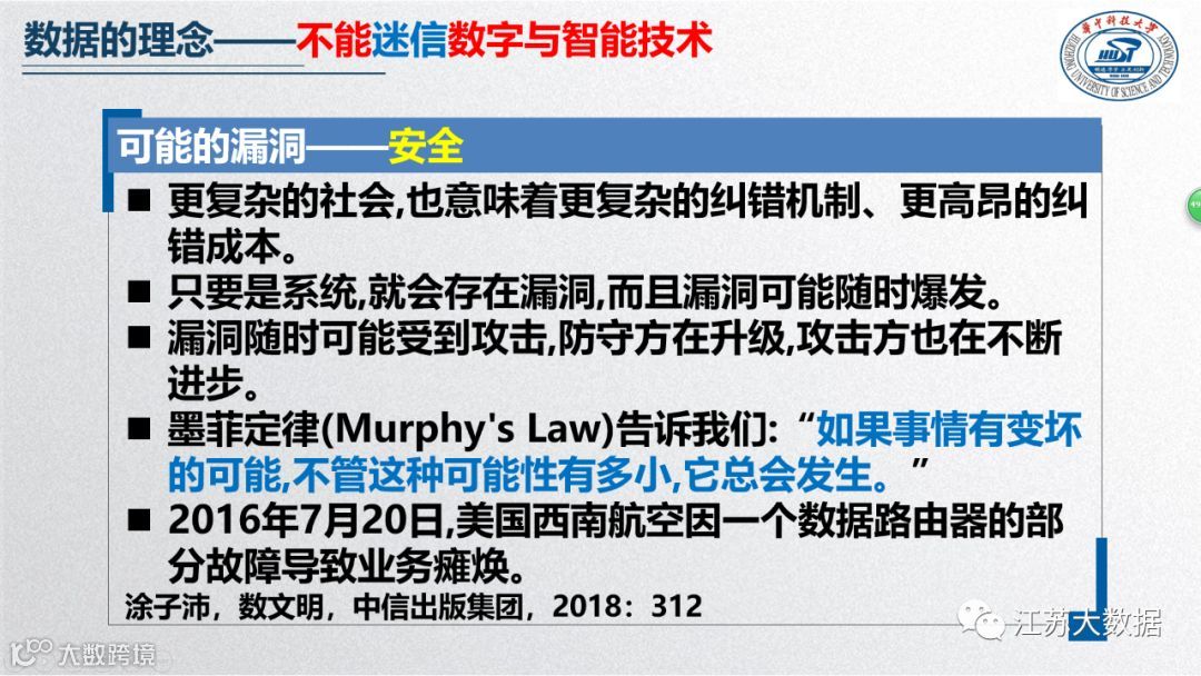 另外不能迷信数字与智能技术,数字与智能技术依然存在漏洞。更复杂的社会,也意味着更复杂的纠错机制、更高昂的纠错成本。正如墨菲定律所说,“如果事情有变坏的可能,不管这种可能性有多小,它总会发生。”我相信这句话还是有一定道理的。