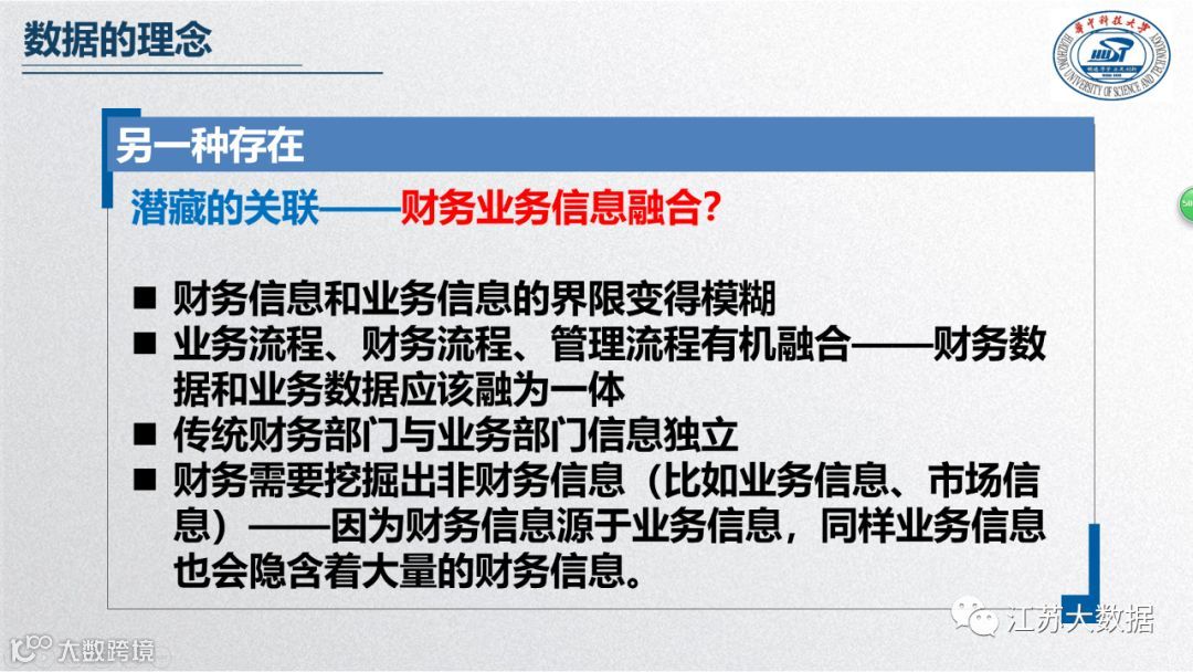 对于企业来说,以财务信息和业务信息的融合为例。实际上,很多企业的财务信息和业务信息并没有很好地融合,就车间里一些具体设计业务的工艺来说,生产上方方面面的信息并没有真正地被财务信息所利用,但实际上这个业务流程是和财务信息相关的。我们没有精细的数据收集,所以传统的信息和业务信息相互独立。因此如何从大量的信息中进行挖掘,进行成本控制是非常有意义的工作。