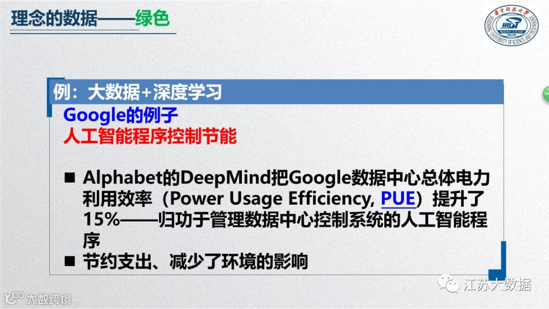 再如,“绿色”也是现代企业的一个重要的理念。“绿色”不光是指没有污染,也指资源消耗少。虽然美国的用电很便宜,但DeepMind谷歌数据中心的耗电量很大。后来通过改进DeepMind把耗电降低了15%,且实现了设备投资的收回。事实上,他们通过数据中心几千个传感器去收集温度、电量、耗电量等设备及建筑物的结构(不同数据中心建筑物的结构都不一样)数据,之后对数据进行深度学习等处理实现节能效果。显然,该例中数据收集的标准即为节能的理念、绿色的理念。因此,类似这类问题是完全没有固定模式的,我们不可能通过建立模型来解决。