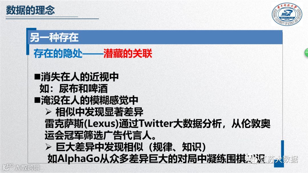 接下来介绍数据的理念,首先数据里面实际上隐含着另外一种存在,以尿布和啤酒为例,虽然超市专家以前没有意识到,但尿布和啤酒销售存在关联。我们很多观点消失在人们的眼睛中,人们看不到,也淹没在人们的模糊感觉中。