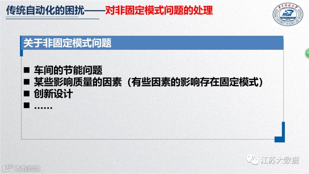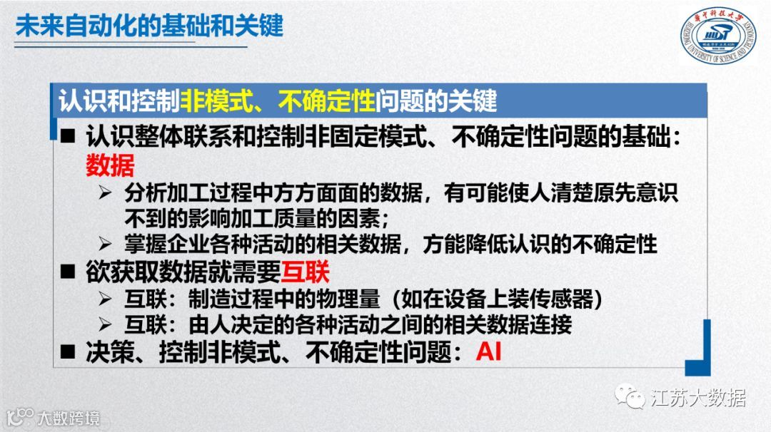 要认识整体联系或控制一些非固定模式,不确定性问题的基础是数据,但有数据就要互联。我们需要人工智能技术去决策控制一些非模式、不确定性的问题,而且人工智能技术也是以数据为基础。