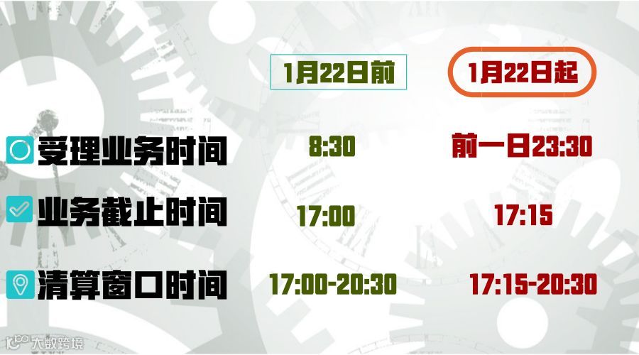 为进一步提升中央银行支付清算服务水平,根据人民银行的统一部署,自2018年1月22日(星期一)起,大额实时支付系统(以下简称大额支付系统)实行5X21小时运行。大额支付系统5X12小时的运行时序将一去不复返啦!