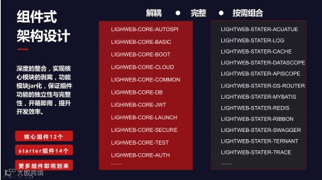 LightWeb平台基础组件层借助于SpringBoot的Starter的模块化技术,深度整合了SpringCloud主流的微服务框架,实现核心模块的解耦,功能职责的单一性,目前主要包括26个功能组件,涉及到微服务运行的配置、注册与发现、熔断与负载、鉴权、开发协同、数据、权限、系统管理、流程、日志、文件等各个方面,极大的屏蔽了底层框架的复杂性,不至于随着平台变大、不可控继而失败,使其可控,可维护,可扩展。