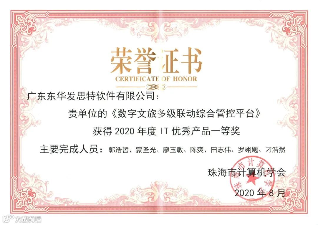 广东东华发思特软件有限公司产品-数字文旅多级联动综合管控平台获评“2020年度IT优秀产品一等奖”,此项荣誉,不仅是对该产品创新能力的肯定,也是对东华发思特产品应用价值的肯定。